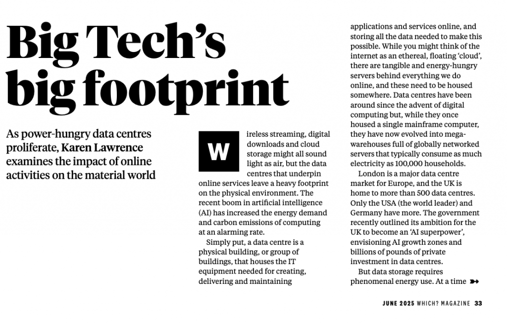 Felippa Amanta was interviewed by Which? Magazine on Big Tech’s Big Footprint. Which? magazine is a monthly magazine published by the UK’s Consumers’ Association offering independent advice to consumers. In June’s issue, Which? spotlighted the energy consumption of online services and digital activities. Felippa commented on the indirect impacts of these online services on our consumption behaviour. For example, AI-led efficiency savings may lead consumers to use or buy more of a product or service.