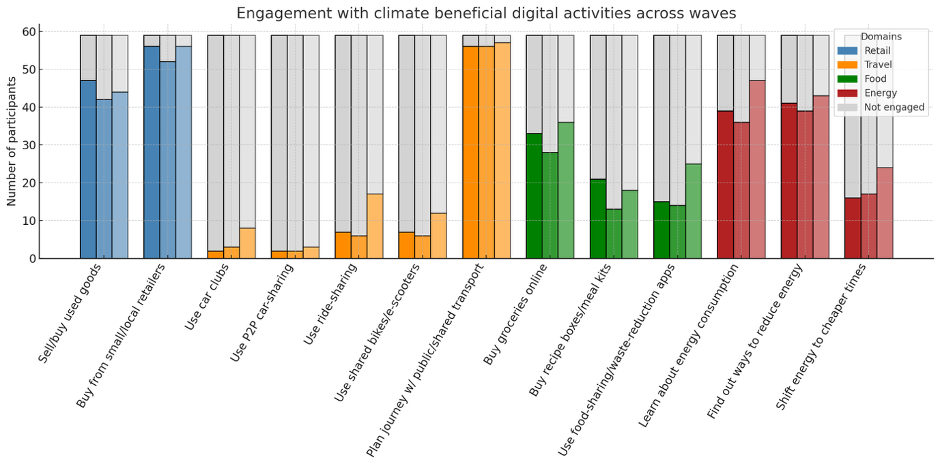 Digital technologies shape both high- and low-carbon behaviours in daily life. To understand how and why these behaviours change, we conducted a three-year Living Lab study with 41 households, combining surveys and interviews. This mixed-methods approach captured real changes as households moved through life stages, adapted routines, and encountered new technologies. Guided by the COM-B model, we examined how capability, opportunity, and motivation influence the uptake of digital tools across retail, energy, food, and travel. Our findings show digitalisation’s sustainability potential is real but fragile: engagement is selective, uneven, and shaped by life stage and shifting motivations rather than linear progress.