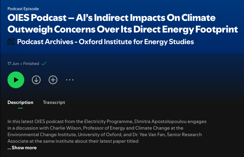 iDODDLE’s Charlie Wilson and Yee Van Fan from the companion CircEUlar project were interviewed for the Oxford Institute for Energy Studies podcast series on AI and energy. They discussed the main findings of their recent paper published in the Oxford Energy Forum journal, co-written also by iDODDLE’s Pippa Amanta. In the paper and the podcast, they argue that focusing narrowly on concerns about AI data centres’ rapidly growing energy needs is missing the much bigger picture of how and for what AI gets used. This will be much more consequential for energy and carbon emissions globally. These insights were also reported by Oxford University itself as part of a look at the effect of generative AI on its sustainability goals.